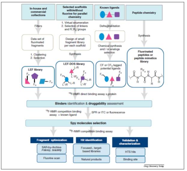 They propose a complete workflow for using 19F NMR (Figure Above). They point out the variety of ways that fluorine can impact the H2L stage. Flourine has many advantages when replacing proton: increased metabolic stability, increased acidity, and decreased basicity. Lipophilicity is increased if the fluorine is near a basic nitrogen or on a aromatic ring. Permeability can be increased. Fluorine can also be a powerful binding moiety by means of H-bond interactions, lipophilic contacts and multipolar and/or antiparallel polar interactions, indirect contact with the protein mediated by water molecules, or by preorganizing the ligand conformation as needed for the protein recognition.However, this leads to a point Dan made almost three years ago: